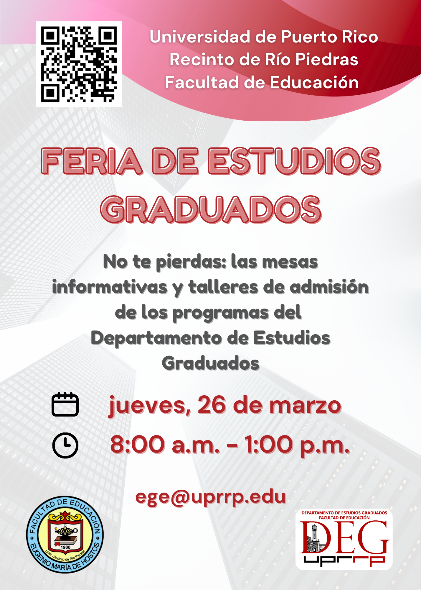 El Departamento de Estudios Graduados de la Facultad de Educación de la Universidad de Puerto Rico, Recinto de Río Piedras les da una calurosa acogida a su portal. En esta página encontrarán información sobre nuestra oferta curricular en los niveles de maestría en las especialidades de Liderazgo en Organizaciones Educativas(LOE), Currículo y Enseñanza (Español, Ciencias, Matemáticas, Historia, Educación Física, Tecnologías del Aprendizaje y en Teoría, diseño y evaluación curricular), Lectura. Escritura y Literatura Infantil, Preescolar, Educación Especial y Diferenciada, Investigación y Evaluación Educativa, Orientación y Consejería, Ciencias del Ejercicio e Inglés como Segundo Idioma; y de doctorado con las especialidades en Liderazgo en Organizaciones Educativas, Currículo y Enseñanza (Español, Ciencias, Inglés, Matemática, Historia, Tecnologías del Aprendizaje y en Teoría, diseño y evaluación curricular) y Orientación y Consejería. Además, contamos con programas de transición directa al doctorado. En estas instancias, en LOE y Currículo y Enseñanza el estudiante toma unos cursos graduados, se somete a un examen calificativo y, si lo aprueba, se integra el programa doctoral. En este portal, también encontrarán documentos informativos, de apoyo y de referencia para nuestros estudiantes mientras trabajan hacia la consecución de sus objetivos académicos.